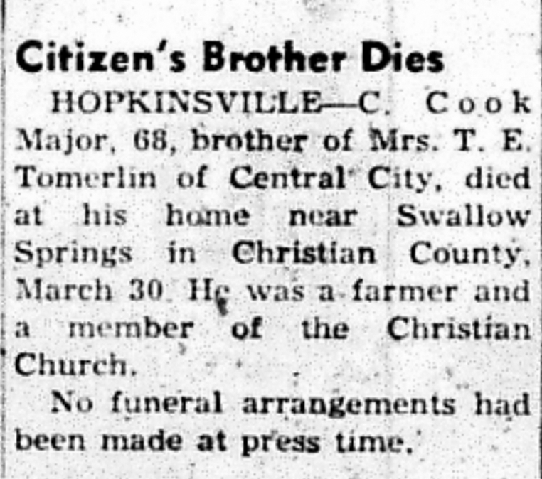 - Major, C. Cook. Messenger [Central City, KY], 31 Mar 1949, Obituary.