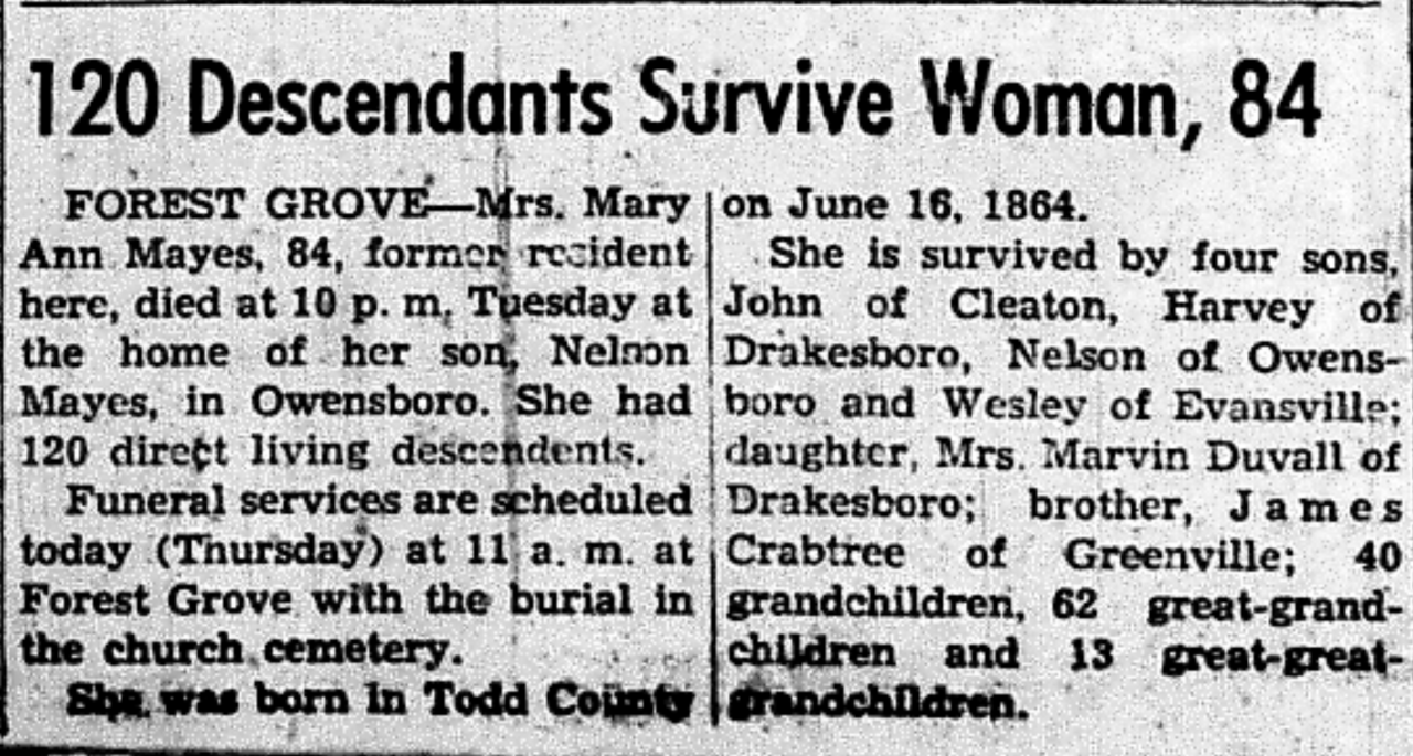 - Mayes, Mary Ann. Messenger [Central City, KY], 10 Feb 1949, Obituary.