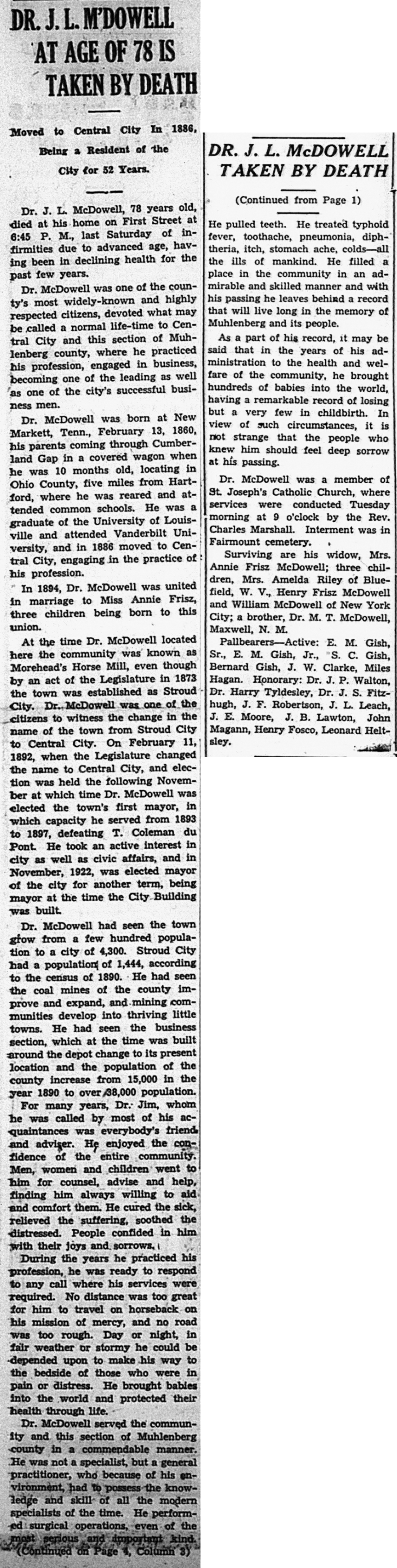 - McDowell, James L. Times Argus [Central City, KY], 13 May 1938, Obituary.