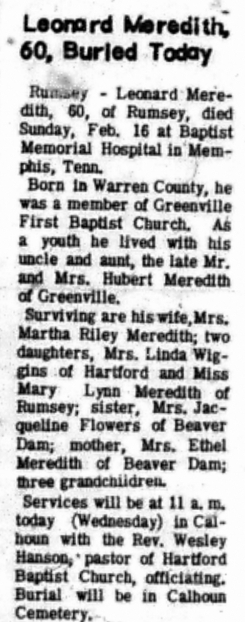 He is survived by his wife, Mrs. Helen Mercer of Los Angeles; two brothers, a twin, Boyce Mercer of Detroit, Mich., Raymond Mercer of Central City; stepmother, Mrs. Elizabeth Mercer of Greenville; five half sisters, Mrs. Tom Ford and Mrs. Elgan Strader of Greenville, Mrs. J.B. Gardner and Mrs. John Stedge of Anchorage, Mrs. Cody Yates of Utica; half-brother, W.W. Mercer of Middletown, Rhode Island.