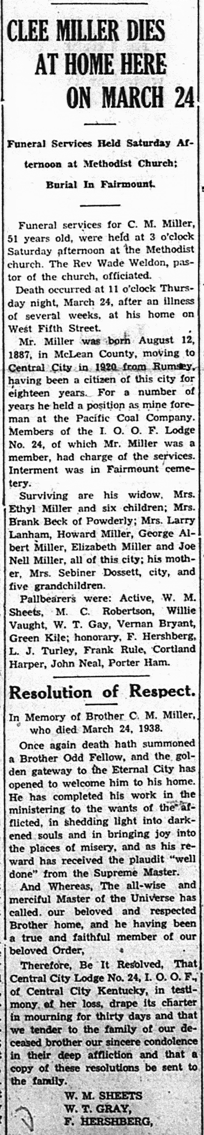 He is survived by his wife, Mrs. Hazel Miller; son, Robert Paul Miller of Hammond, Ind.; daughter, Mrs. E. C. Gray of Central City Route 2; six grandchildren; sister, Mrs. Nora Warner of Central City.