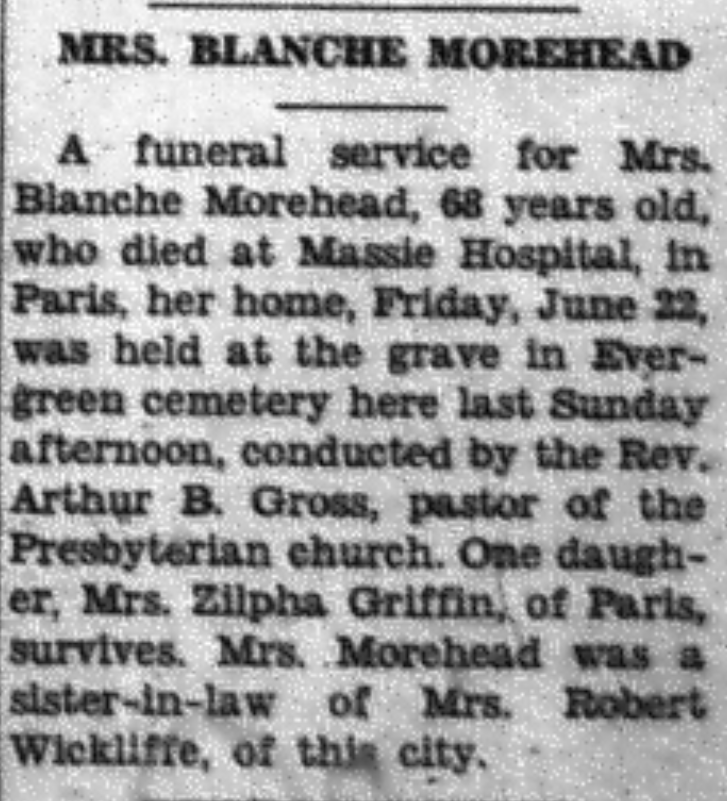 - Morehead, Blanche. Greenville Leader [KY], 29 June 1934, Obituary.