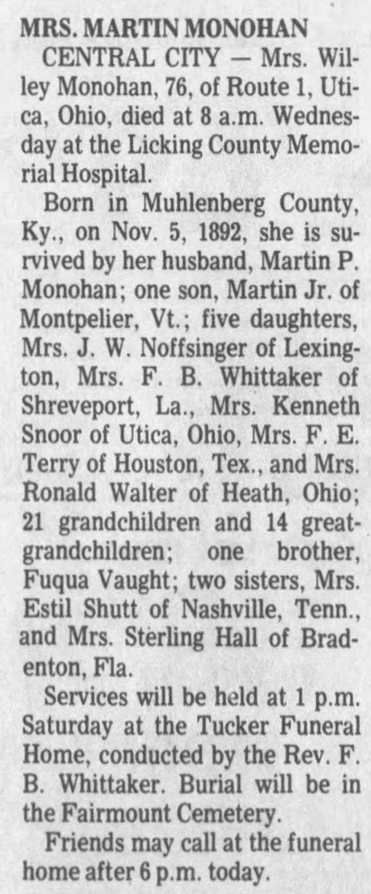 - Monohan, Willey. Messenger Inquirer [Owensboro, KY], 17 Oct 1969, Obituary.
