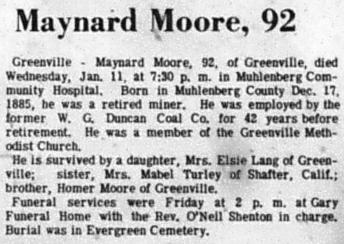 - Moore, Maynard. Times Argus [Central City, KY], 18 Jan 1978, Obituary.