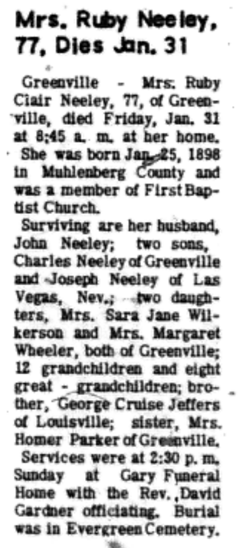- Neeley, Ruby. Times Argus [Central City, KY], 5 Feb 1975, Obituary.