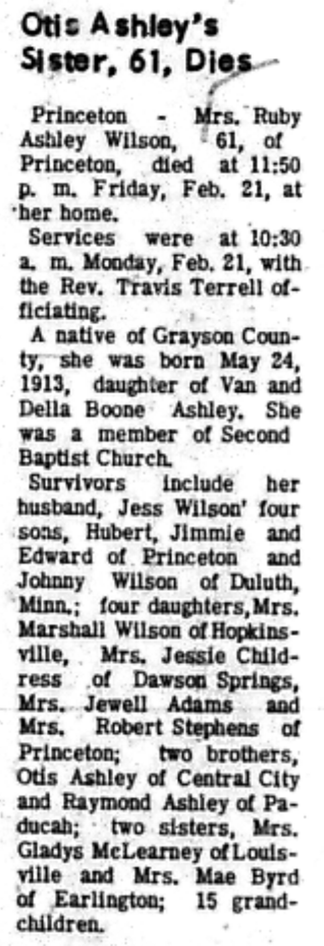 - Wilson, Ruby Ashley. Times Argus [Central City, KY], 26 Feb 1975, Obituary.