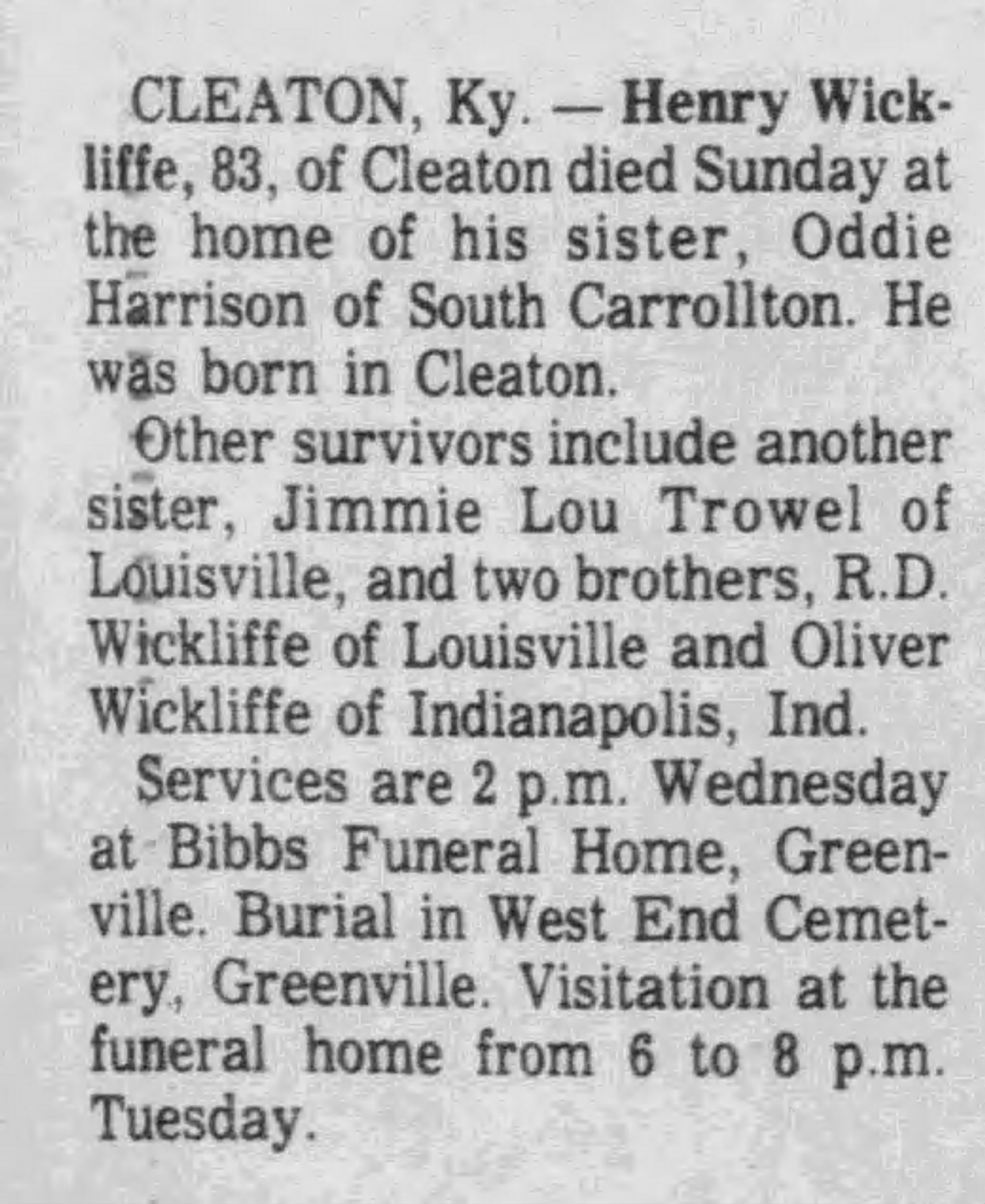 - Wickliffe, Henry. Messenger Inquirer [Owensboro, KY], 14 Feb 1977, Obituary.