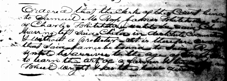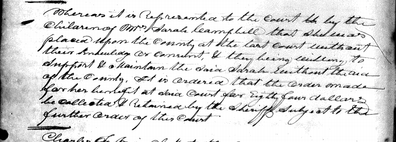 Whereas it is represented to the court by the children of Mrs. Sarah Campbell that she was placed upon the county at the last court without their knowledge or consent, & they being willing to support & maintain the said Sarah without the aid of the county, it is ordered that the order made for her benefit at said court for eighty four dollars be collected & retained by the sheriff subject to the further order of this court. [Image]