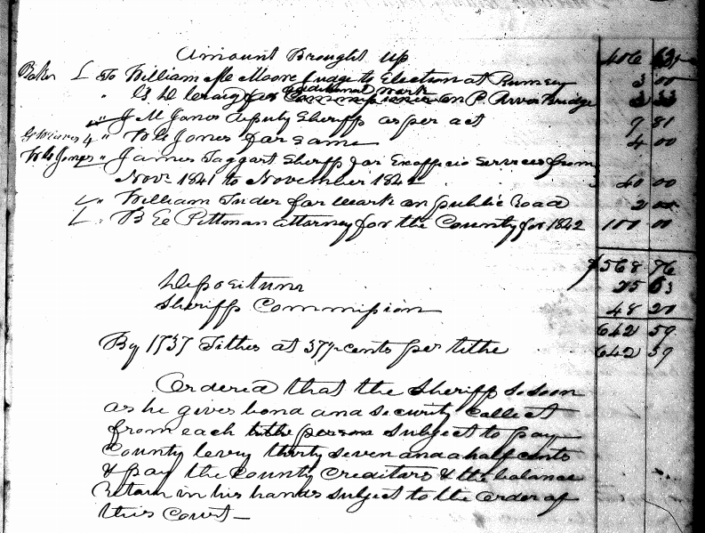 Ordered that B.S. Young commissioner be allowed ten dollars & fifty cents the 20 percentum deducted from his allowance as commissioner for the year 1842 with a deduction of one dollar returned by the sheriff for 2 tithes not listed which is ordered to be certified.