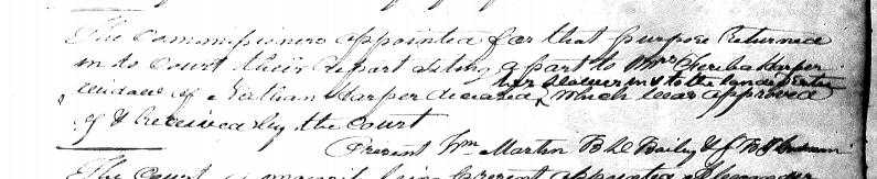 The commissioner appointed for that purpose returned in to court their report setting apart to Mrs. Feruba Harper, widow of Nathan Harper deceased, her dower in & to the lands & estate which was approved of & received by the court. [Image]