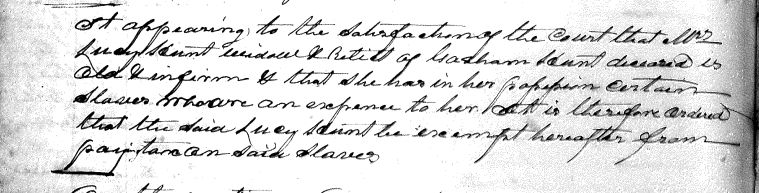 It appearing to the satisfaction of the court that Mrs. Lucy Hunt, widow & relict of Gasham Hunt deceased, is old & infirm & that she has in her possession certain slaves who are an expense to her, it is therefore ordered that the said Lucy Hunt be exempt hereafter from paying tax on said slaves. [Image]