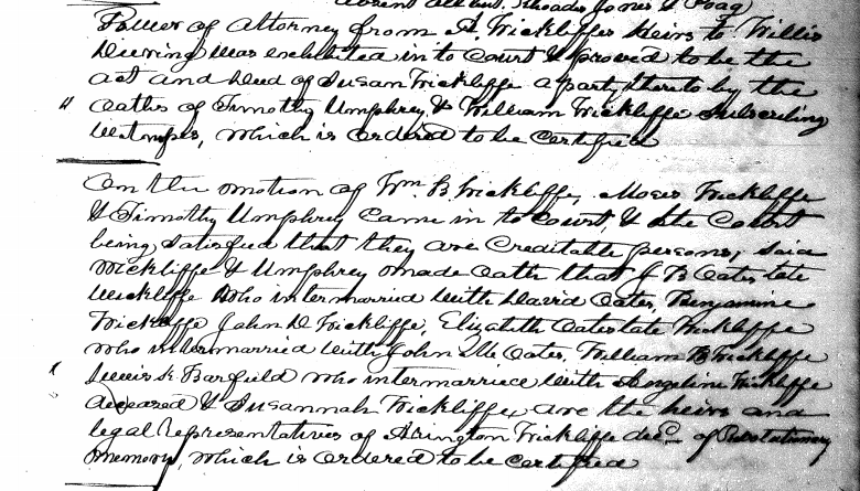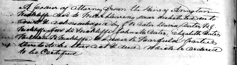A power of attorney from the heirs of Arington Wickliffe decd. to Willis Dearing was exhibited in to court & acknowledged by J.B. Oates, David Oates, B.J. Wickliffe, Jno. D. Wickliffe, John M. Oates, Elizabeth Oates, William B. Wickliffe & Lewis K. Barfield parties thereto to be their act & deed, which is ordered to be certified. [Image]
