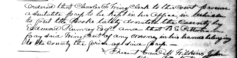 [copied] Ordered that E.M. Brank, treasurer for the county, pay in to the hands of John Vickers & Elisha Baker or either of them one hundred dollars for the improvement of that part of the road leading from Greenville to Rumsey that lies between Vickers Bridge & Rumsey & that they let said improvements & make report thereof.