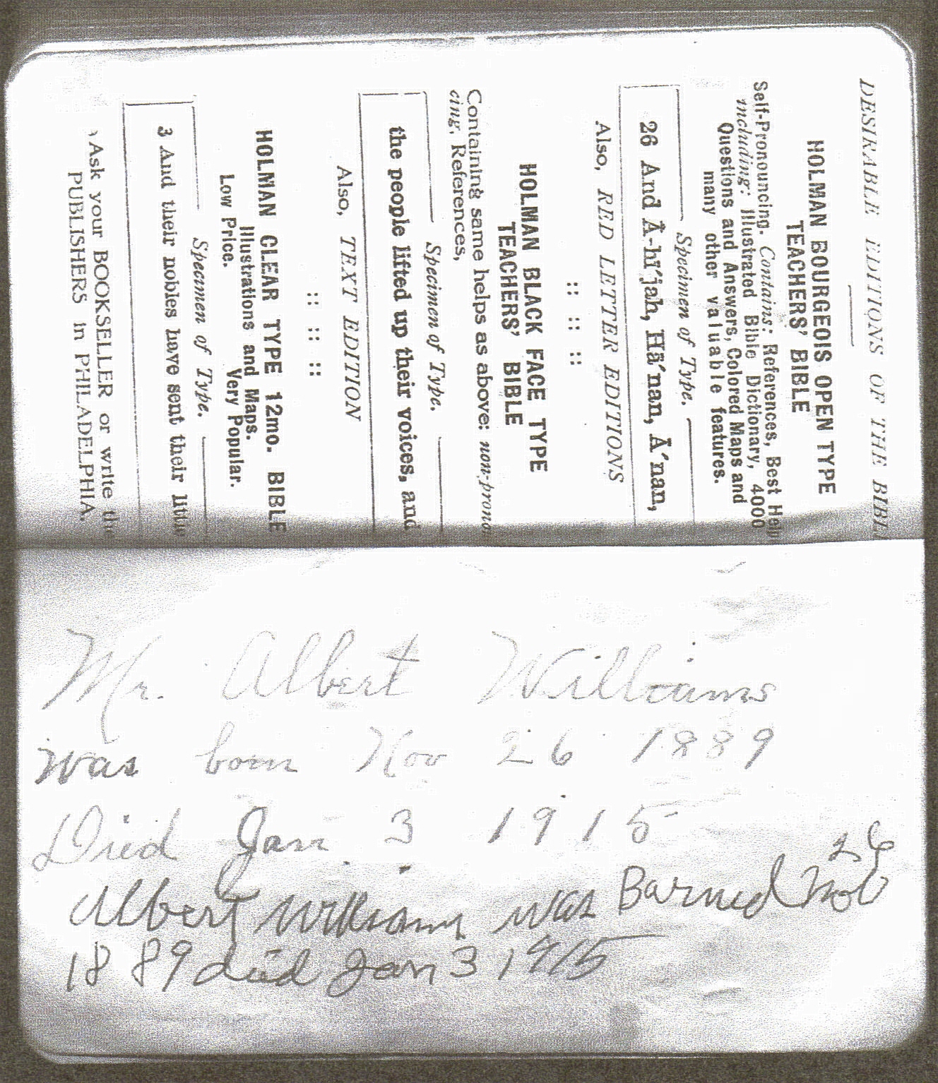 Mr. Albert Williams was born Nov. 26, 1889 & died Jan 3, 1915.