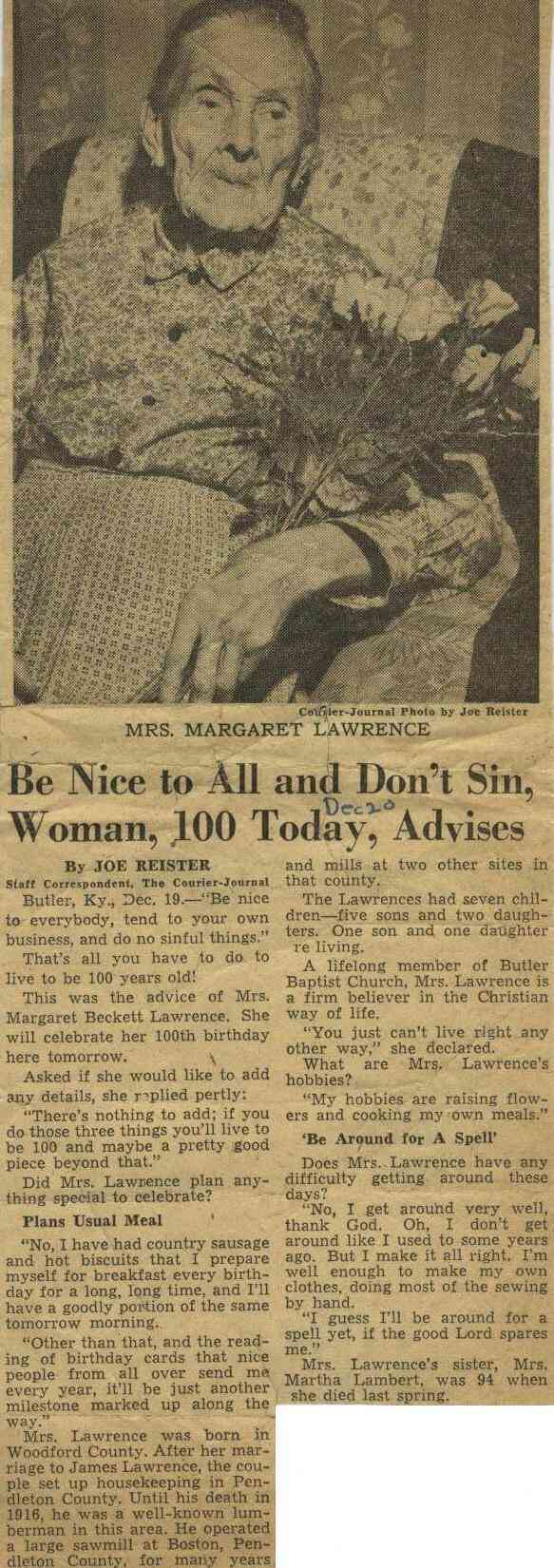 For her 100th birthday, the Courier-Journal (in Louisville) published an article on Margaret Lawrence on December 19, 1950. While cleaning out a relative’s house a few years ago I happened to find a copy of this article. From reading it you get the impression she was quite a remarkable lady.