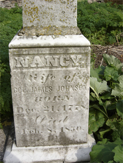 ADAMS, Malvina J. - Apr 20, 1806 - Dec 21, 1828, w/o George W. JOHNSON, Ann W. - Feb 6, 1812 - Jun 6, 1841, w/o Gen. Wm. Johnson JOHNSON, Douglas A. - Jul 10, 1817 - Jun 17, 1826 s/o John T. & Sophia Johnson JOHNSON, Edwin - May 28, 1822 - Jul 1, 1822, s/o Edward P. & Betsy Johnson JOHNSON, Eliza D. - Mar 29, 1820 - May 29, 1849, w/o R. M. Johnson JOHNSON, Evalina Jemima - Aug 17, 1805 - Aug 26, 1820, d/o Col. J. & Nancy Johnson JOHNSON, George W. - Nov 18, 1792 - May 17, 1810 JOHNSON, Helen Hickman - Apr 21, 1801 - Sep 10, 1823, w/o Capt. Wm. Johnson JOHNSON, Hickman P., - ? - Aug 6, 1821, 12 days, s/o Wm. & Helen Johnson JOHNSON, Col. James - Jan 1, 1774 - Aug 13, 1826, 52 years JOHNSON, Jemima - June 29, 1753 - Feb 23, 1814, 60 years JOHNSON, Nancy - Dec 21, 1778 - Feb 8, 1850, w/o Col. James JOHNSON, Robert - Apr 20, 1786 - Aug 5, 1819 JOHNSON, Col. Robert - Jul 17, 1745 - Oct 15, 1815, 70 years JOHNSON, Sally Ann - Sep 10, ???? - May 23, 1818, d/o Edward P. & Betsy Johnson JOHNSON, William - ??? - Aug 3, 1841, 72 days, s/o Wm. & Ann Johnson JOHNSON, Col. William - ???? - Apr 25, 1814, 38 years OFFUTT, James W. ???? - May 14, 1891, 50 years (no stone, family source) TURNER, William T. - Aug 5, 1869 - Jul 22, 1894 WARD, Ann J. - Aug 31, 1801 - Mar 27, 1823, w/o Robert Ward WARD, Sallie - Jan 21, 1778 - Aug 25, 1816 Broken Stone - 1806 - Jan 22, 1880 |