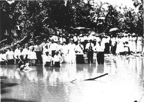 River Baptist Church Congregation. The little boy being baptized in The