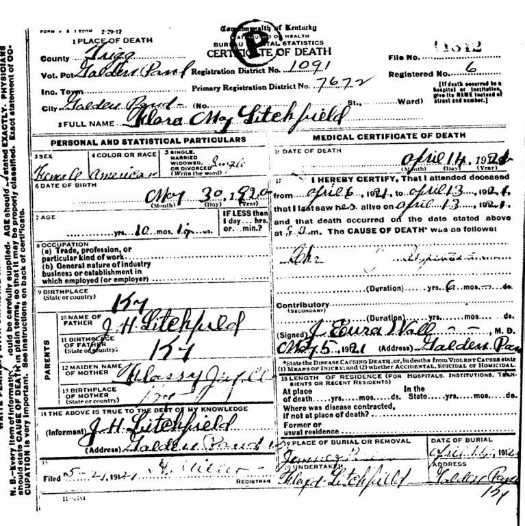 30, 1920 - Aapr 14, 1921 d/o John & Flossie - certificate