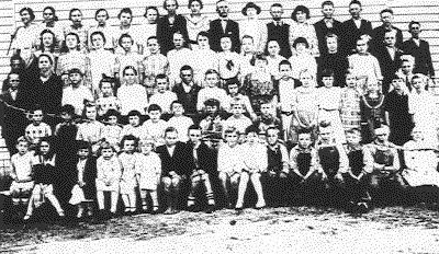"At the time this picture was made, Mrs. Beulah Thompkins was teacher of the big room, grades five through 8. Mrs. Frances Bridges was teacher of the little room, grades primer through fourth grade.