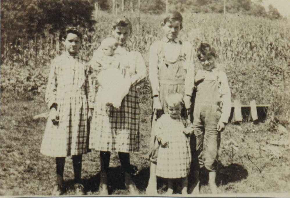The children are, left to right: Leah (1910-1988), Rachel (1908-1971) - Rachel is holding her baby brother, Kaywood (1920-1974) - Rob (1906-1993), Jimmy (1912-1984), Frank wearing "shirt tails" resembling a dress (1917-1997).
