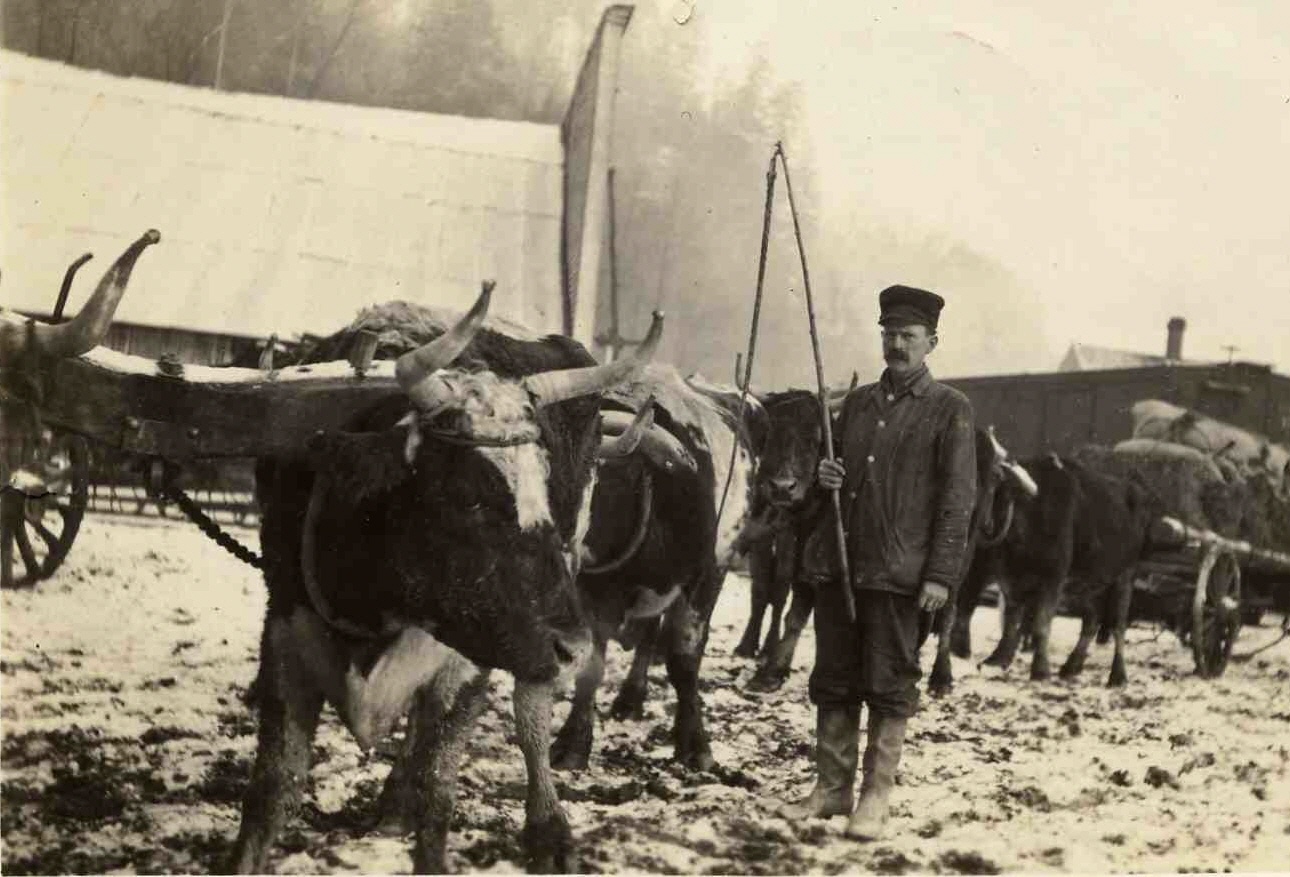 This picture shows William Porter Lacy in the early 1900's hauling freight with his oxen team from the train back to Campton.
