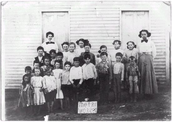 3rd row standing on right in front of teacher is Simeon Spencer, born 1895, son of Dock and Polly Puckett Spencer, in the center 2nd row is a Bush boy.