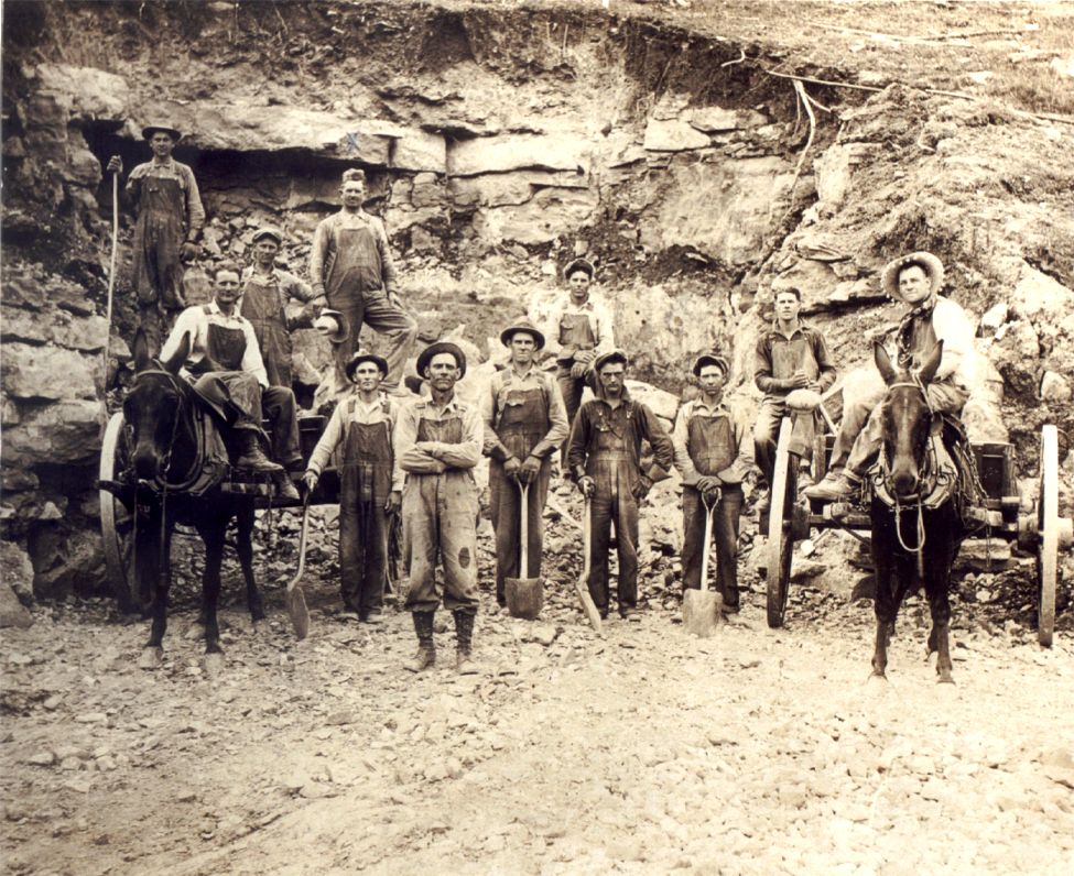 The man with his hat in his hand standing on the wagon is John Clair. The man standing above the wagon holding a stick (maybe to pry the boulders with) is Wison nickell. The thrid and tallest man standing on the ground wearing hat and both hands on the shovel is George Clair.
