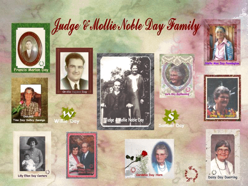 Center are Parents   Judge Day - Born: 06/24/1876; Died: 02/27/1950 Mollie Noble - Born: 09/15/1876; Died: 08/18/1968   Starting from upper left, ending at upper right are the children: Francis Marion Day - Born: 10/07/1876; Died: 11/19/1922 Orville Eugene Day - Born: 11/11/1915; Died: 01/23/1966 Tina Day Salley/Swango - Born: 10/05/1900; Died: 09/10/1986 Lilly Ellen Day Centers - Born: 02/18/1910; Died: 04/19/1976 Fern Omega Day Center - Born: 01/28/1918; Died: ??/??/???? Cordelia Day Horn - Born: 4/28/1904; Died: 10/05/1995 Daisy Day Duerring - Born: 03/13/1906; Died: 06/26/2002 Grace Day Stamper - Born: 12/19/1907; Died: 11/27/2000 Cora Day Blankenship - Born: 09/18/1902; Died: 03/12/2003 Stella Day Pennington - Born: 07/22/1913; Died: 05/06/1999   Contributed by