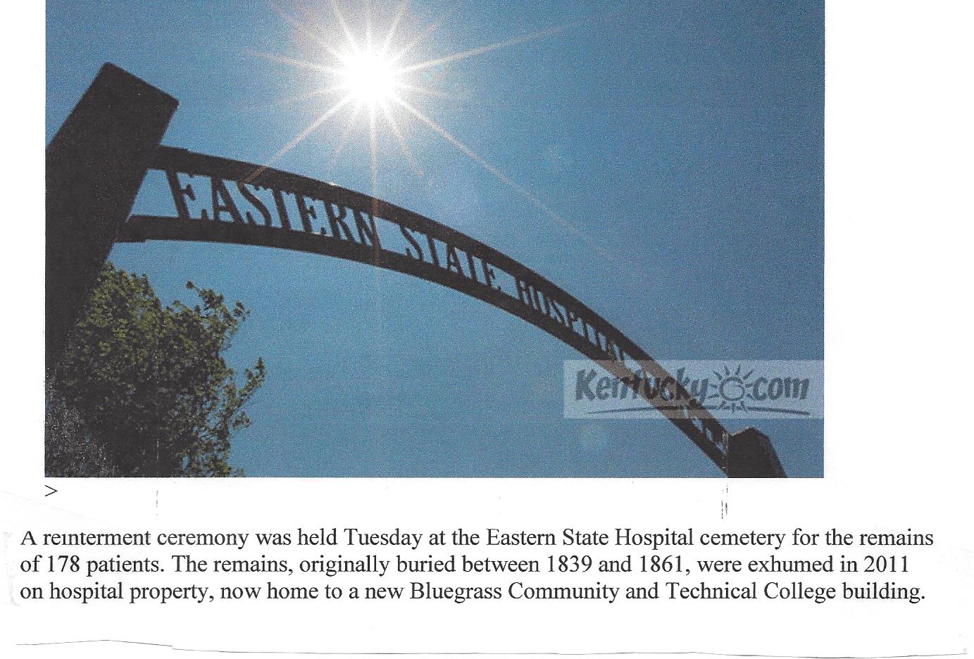 In June of 2005 eleven graves were unearthed while laying new water lines on the hospital grounds. Ten of the remains were in a mass grave, with the 11th grave nearby. After nearly two years of studying the remains by the University of Kentucky Archeological Department, they were interred on April 11, 2007 at Eastern State Hospital. Each of the remains were placed in a plan wooden box with a small plate describing the sex and estimated age. Per the archeological report, it was estimated that the original burials occurred sometime between 1830 and 1860.
