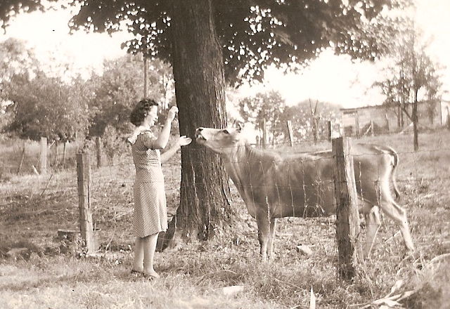 Della Rae Hurt Garrett of Edmonton, Kentucky in 1946 with a cow.