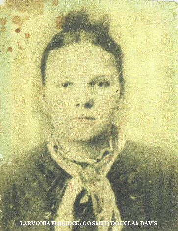 Larvonia Elbridge (Gossett) Douglas Davis was the daughter of James T. & Eliz C. (Slaughter) Gossett. She married for the first time to James L. Douglas on 25 January 1872 in Metcalfe Co KY. James L. died while in his thirties from gangreen after falling from a ladder and injurying his leg. He is buried near Wisdom, in Metcalfe Co KY. Elbridge was left with six young children to raise. She remarried on 26 July 1914 in Metcalfe County to Joseph Green Davis. She is buried in the Douglas-Poynter Cemetery in Northern Metcalfe County.